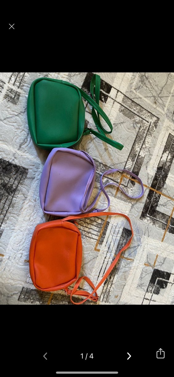 Pastel yeşil, mor ve turuncu renklerde, fermuarlı küçük deri çapraz çantalar. Sokak stili ve günlük kullanım için uygun.
