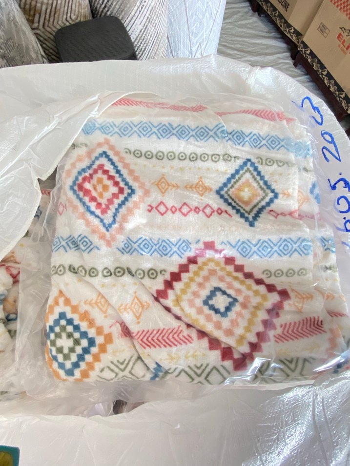 Pastel renklerde çok renkli desenli, yumuşak ve konforlu kumaştan yapılmış battaniye. ️