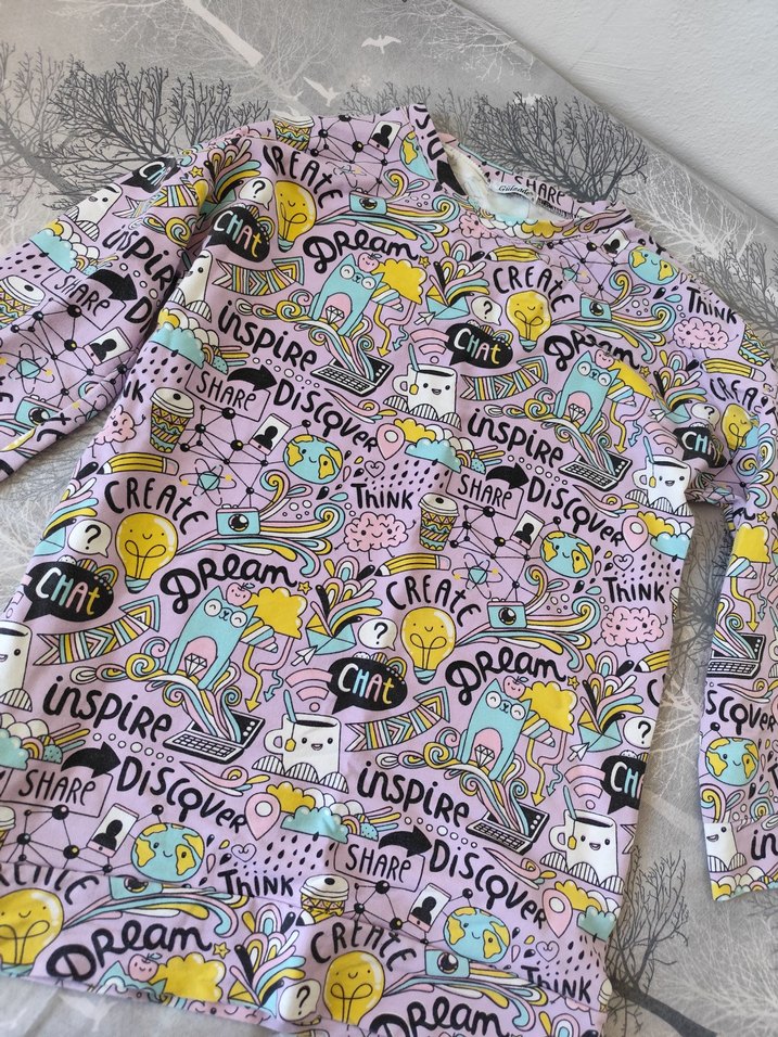 Pastel çok renkli baskılı çocuk kıyafeti, ilham verici kelimeler ve eğlenceli desenlerle. Yumuşak ve sıcak kumaştan üretilmiştir.