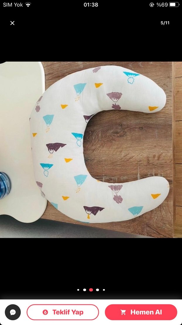 Pastel renklerde çok renkli desenli, konfor ve destek sağlayan hilal şeklinde hamile ve emzirme yastığı.