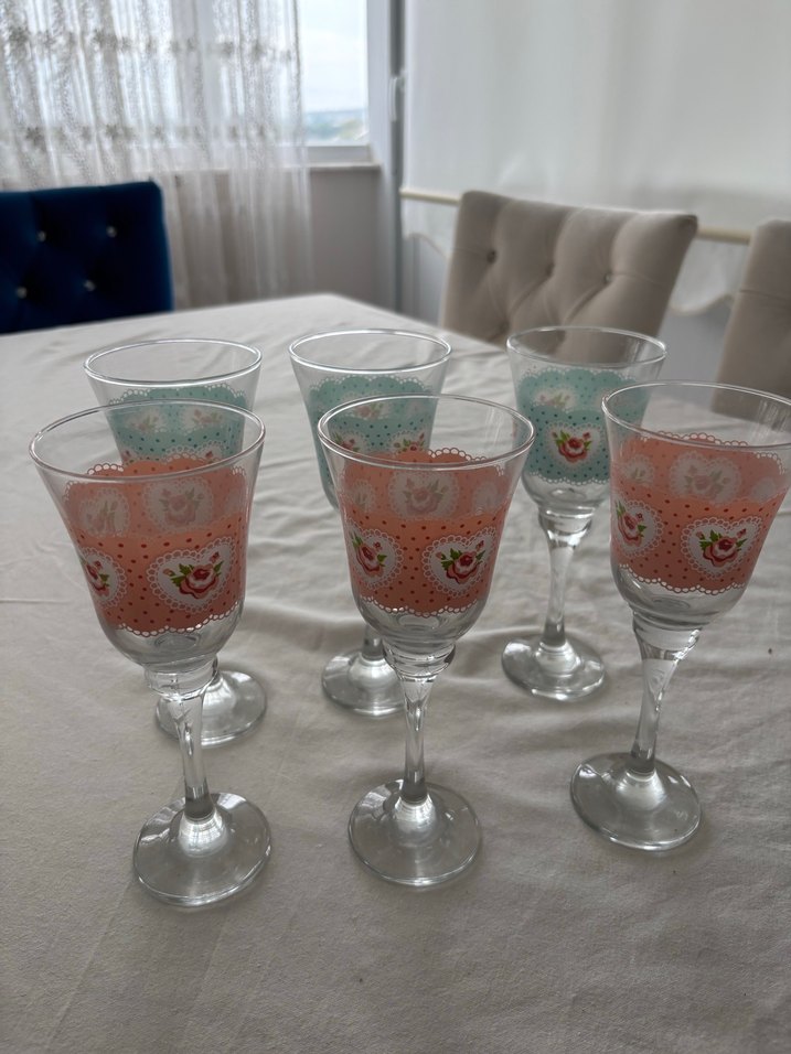Pastel pembe ve mavi tonlarda çiçek desenli, içecek servisi için uygun cam kadehler seti.