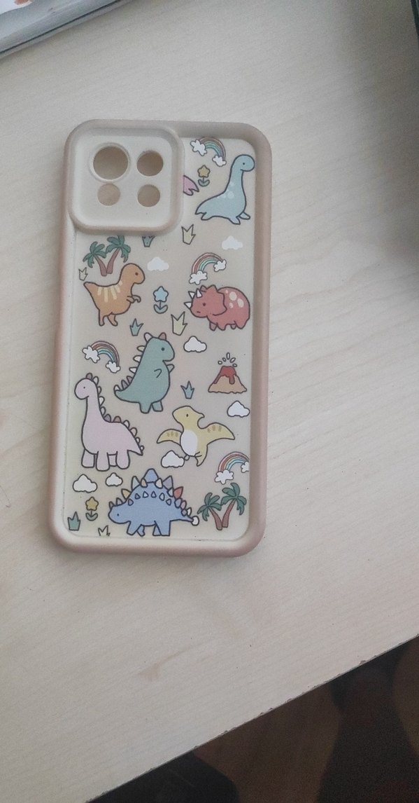 Pastel renklerde, sevimli dinozor desenleri ve boncuk detayları bulunan pop kültür tarzında telefon kapağı. Arkasında kabartmalı 'M' işareti mevcuttur.