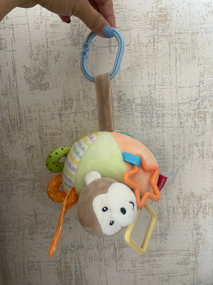 Yumuşak maymun figürlü, pastel renkli diş kaşıyıcı ve çıngırak. Farklı dokular ve tutması kolay halkalar içerir.