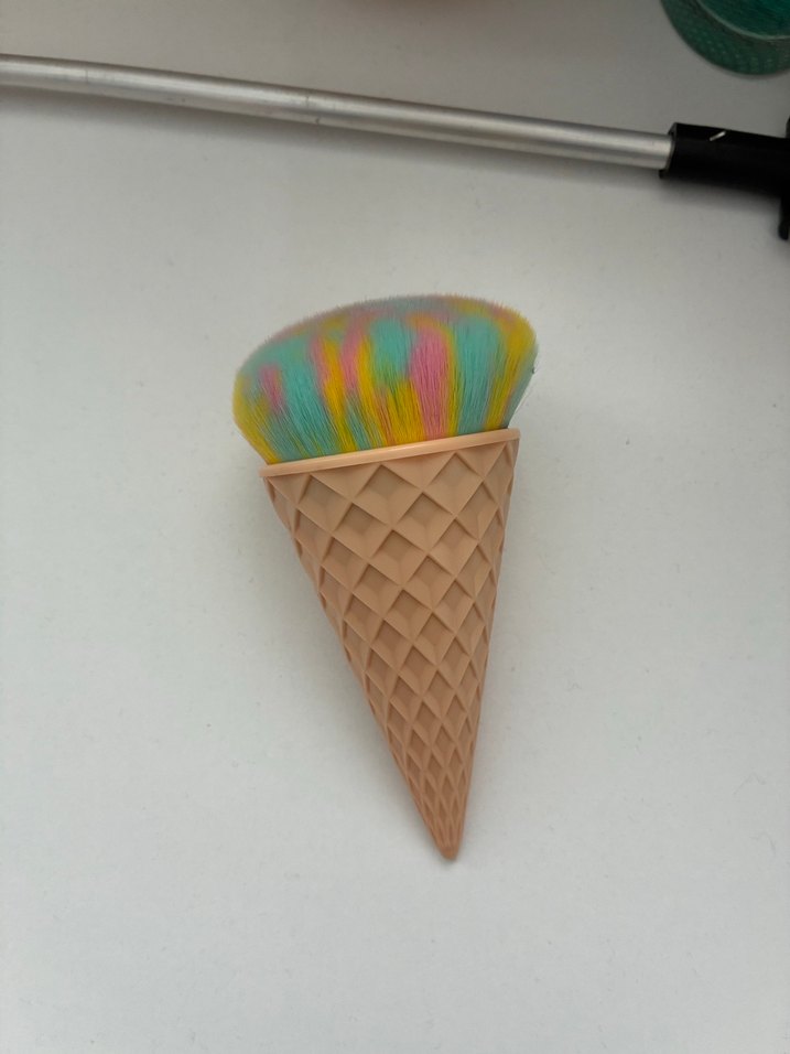 Pastel renklerde çok renkli kıllara sahip, dondurma külahı şeklinde saplı allık fırçası.