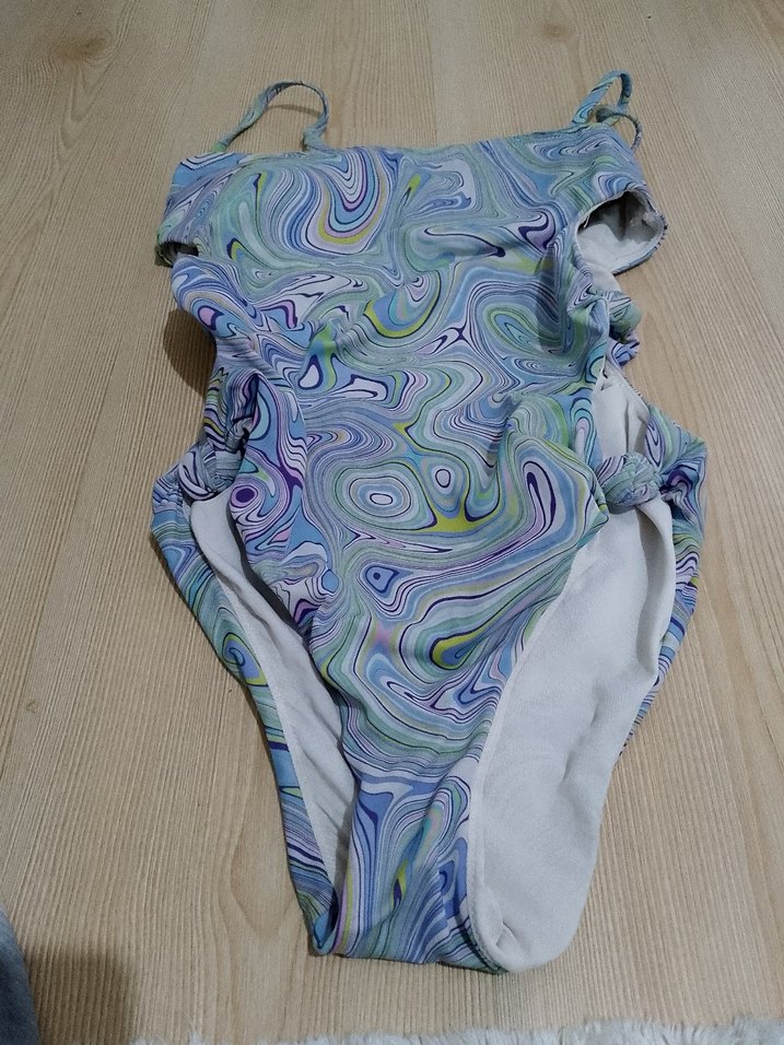 Pastel tie-dye desenli, drapeli, uzun kesim ve kolsuz kadın mayo. Bohem ve avant-garde tarzıyla plajda şık bir seçenek sunar.