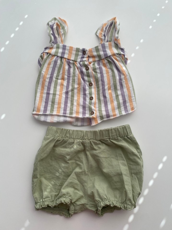 Pastel renklerde, düğmeli askılı üst ve khaki lastikli şortlu bebek kız takımı. 3.6 aylıktır