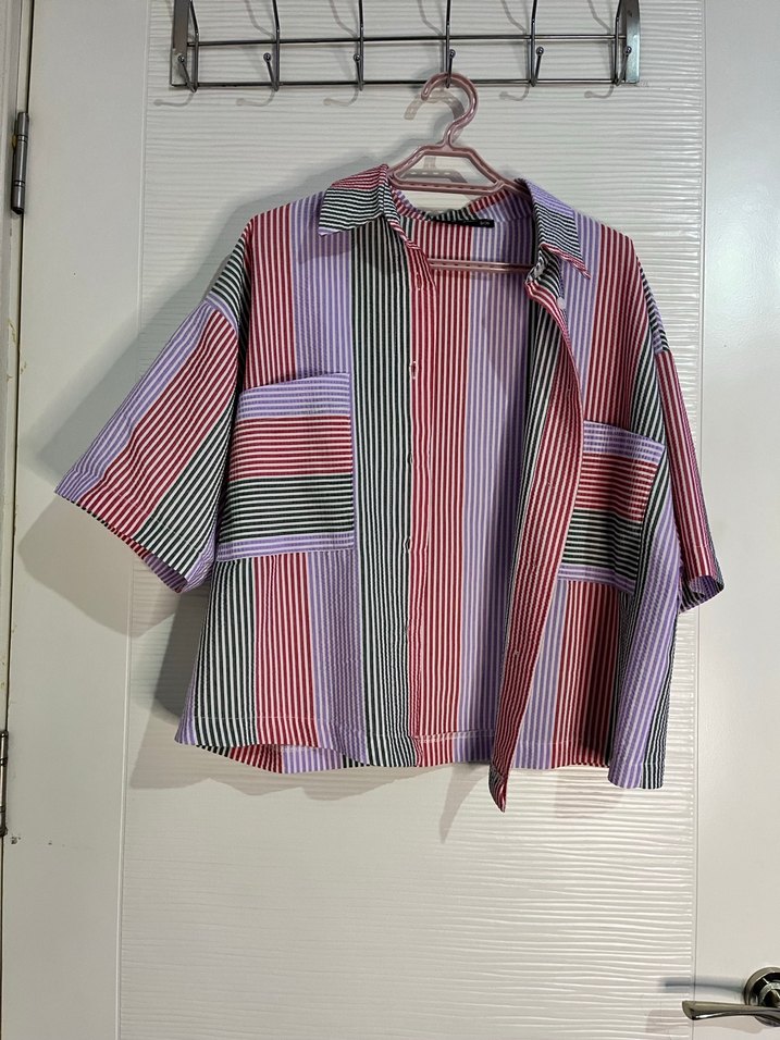 Bu kadın gömleği, kısa kollu, yakalı ve pastel çok renkli çizgili desene sahiptir. Düğmeli ve kısa kesim, rahat sokak stili için uygundur.