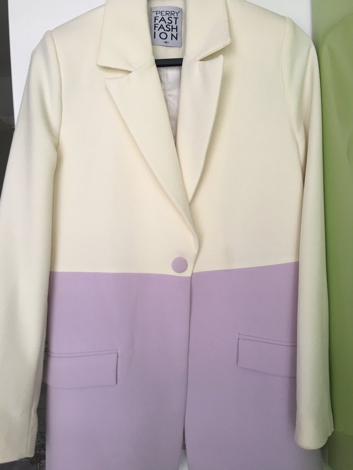 Kadınlar için notched yaka ve düğmeli kapamalı blazer. Pastel iki tonlu, uzun kollu ve normal kesim. Yumuşak sentetik kumaştan, ofis için uygun modern tarzda.