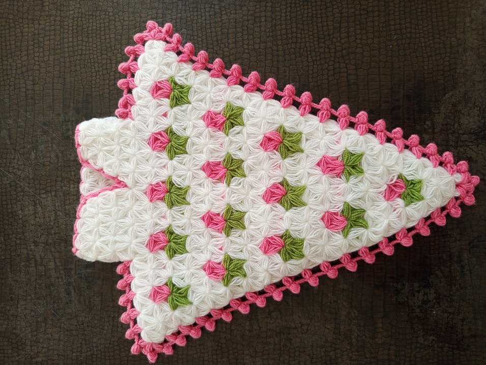 Pastel renklerde, çiçek desenli el örgüsü yumuşak ve dekoratif banyo lifi.