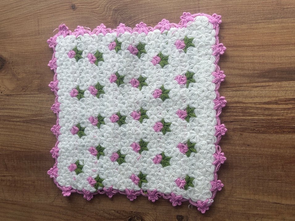 Pastel tonlarda, beyaz zemin üzerinde pembe ve yeşil çiçek desenli el yapımı banyo süngeri. Nazik temizlik için uygundur.