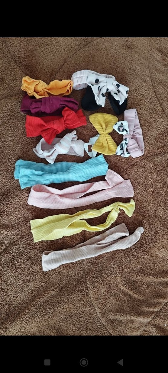 Pastel renklerde elastik çocuk saç bantları ve fiyonklar, düz ve benekli desenlerle yumuşak, esnek kumaşlardan oluşur.