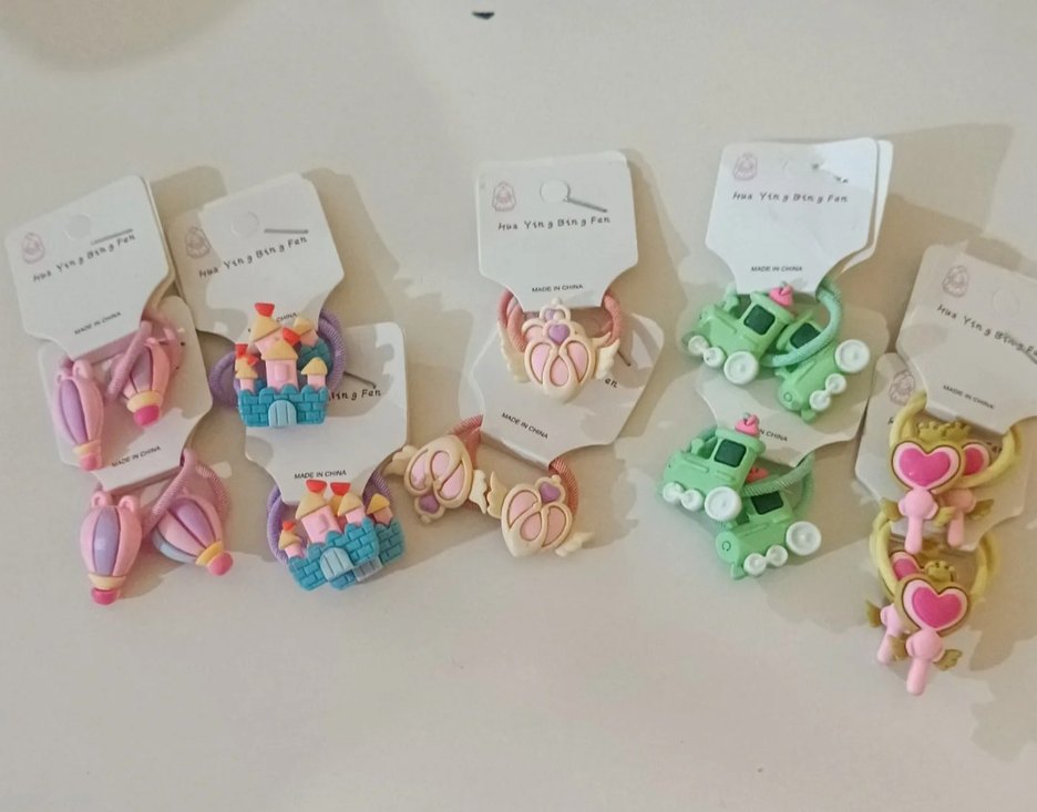 Pastel renklerde elastik çocuk saç tokaları, kale, şeker ve araç desenleriyle bohem tarzda eğlenceli aksesuarlar.