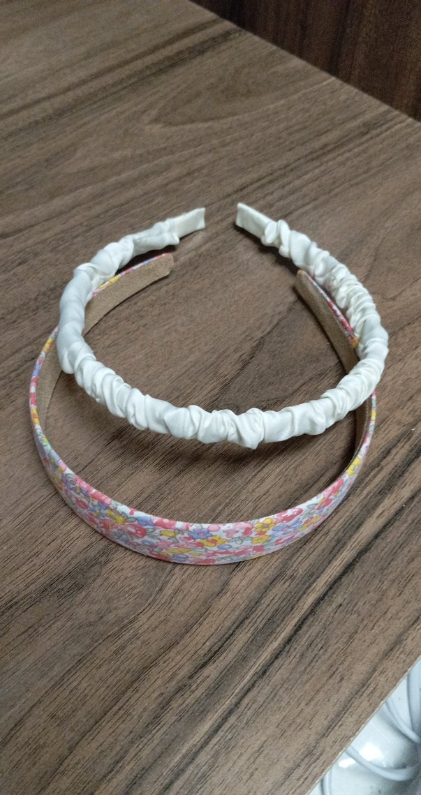 Pastel tonlarda, biri elastik beyaz kumaşlı, diğeri renkli vintage çiçek desenli sentetik kumaşlı iki kadın saç bandı.