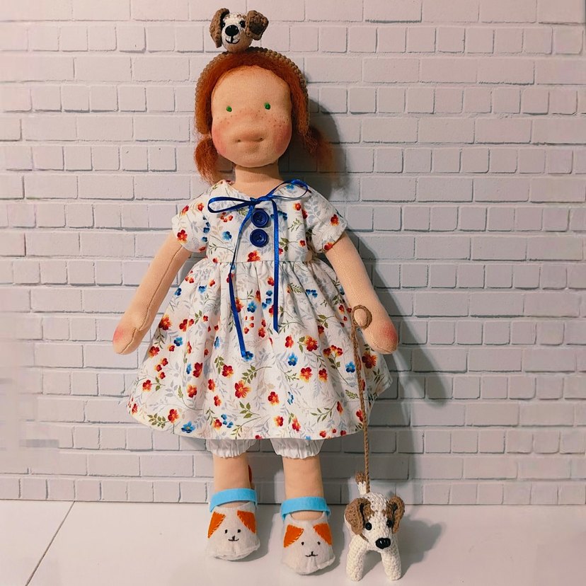 Beyaz çiçekli elbise, mavi düğme ve kurdeleli yumuşak bebek, yanında küçük köpek figürü ve uyumlu terlikler ile birlikte.