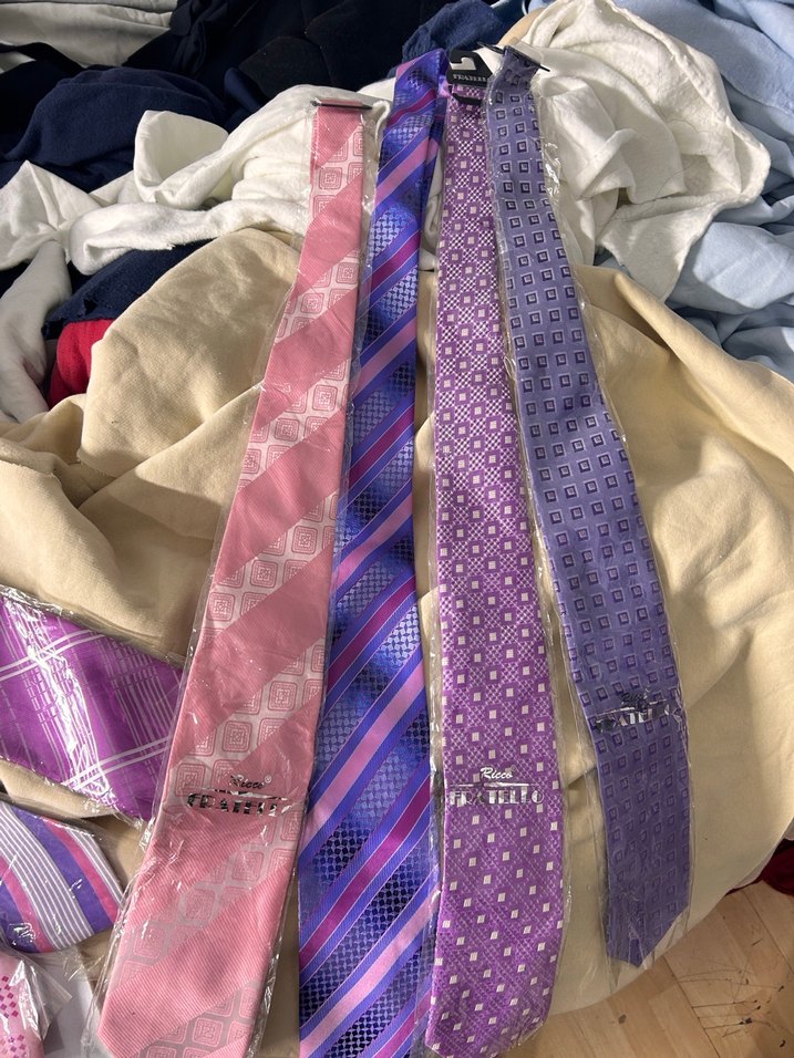 Pastel tonlarda pembe, mor ve mavi renklerde dört erkek kravatı seti. Farklı geometrik ve çizgili desenlere sahip, şık ve yenilikçi iş tarzı için uygun.