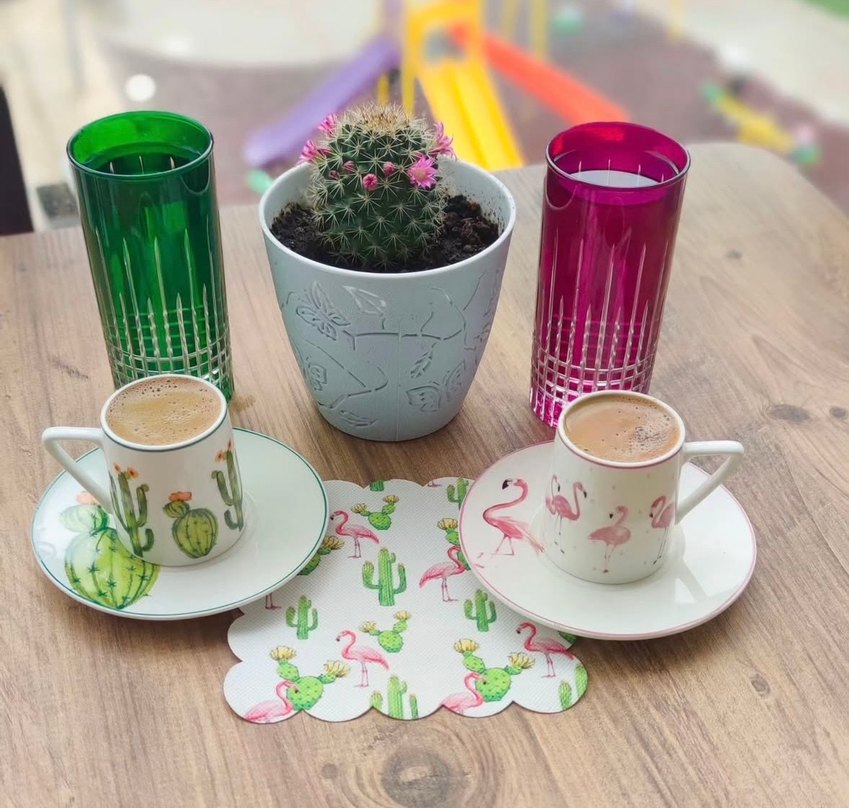 Pastel renklerde flamingo ve kaktüs desenleriyle bardak altlığı, masanıza neşeli bir dokunuş katıyor. ☕