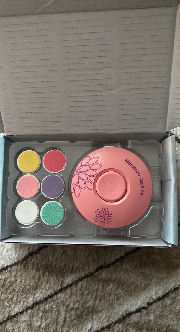 Altı farklı pastel renkten oluşan göz farı paleti ve üzerinde 'Manicure fashion' yazan pembe bir kutu içerir.