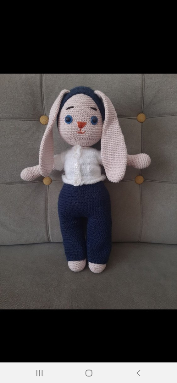 Beyaz gömlek ve lacivert pantolon giymiş, yumuşak örme dokulu, uzun kulaklı pastel renkli gri amigurumi tavşan oyuncak.