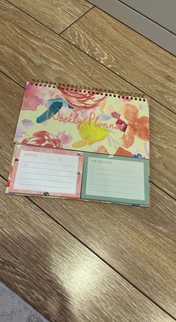 Pastel renklerde, spiral bağlı haftalık planlayıcı defter. Notlar ve yapılacaklar listesi bölümleri bulunur.