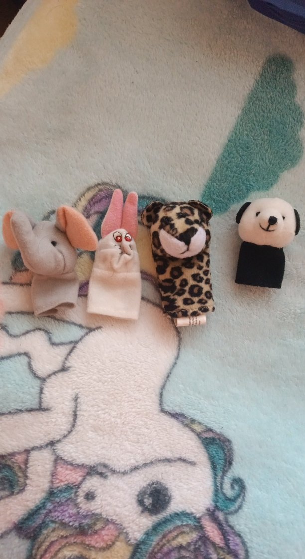 Fil, tavşan, leopar ve panda figürlü pastel renkli parmak kuklaları seti. Yumuşak ve eğlenceli oyuncaklar .