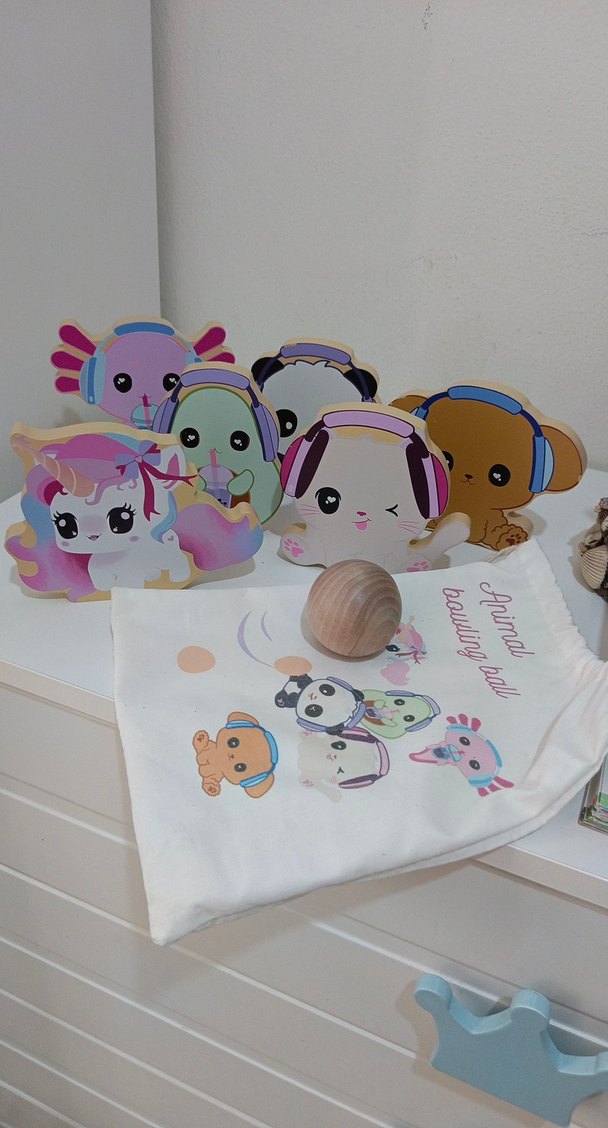 Pastel renklerde, kulaklıklı sevimli hayvan figürlü ahşap oyuncaklar ve hayvan baskılı kumaş çantadan oluşan renkli oyun seti.