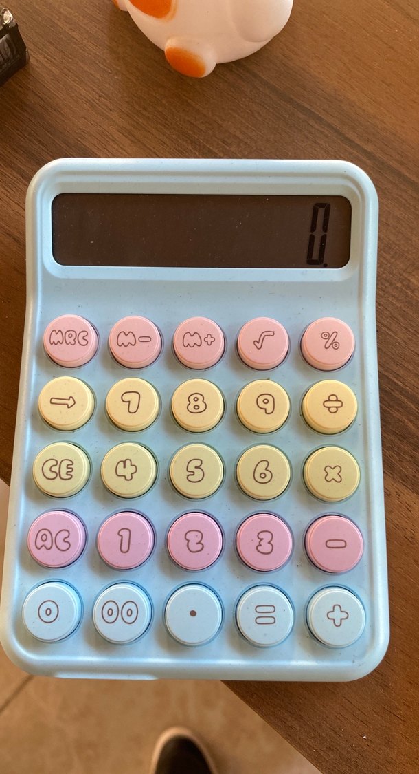 Pastel renklerde, çok renkli yuvarlak tuşlara sahip hesap makinesi. Temel aritmetik ve sayılar için tuşlar bulunur.