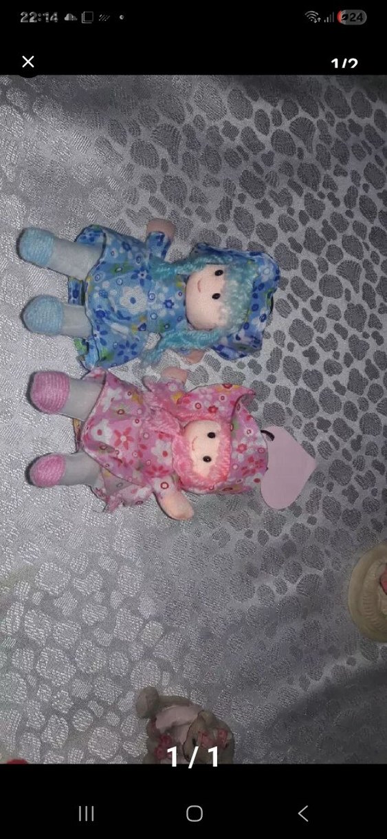 Mavi ve pembe çiçekli kıyafetler giymiş, şapka ve ayakkabıları uyumlu iki pastel renkli bebek anahtarlik