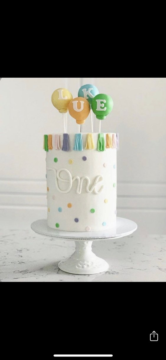 Tüm konseptlere uygun maket pasta çalışılır bu model 500 tl Pastel renklerde yuvarlak harfli balonlar ve püskül süslemeleriyle ilk yaş pastası için uygun bir dekorasyon.