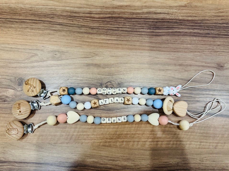 Pastel renklerde, isimli bloklar ve ahşap detaylı emzik askısı. İsme özel yaptırılır