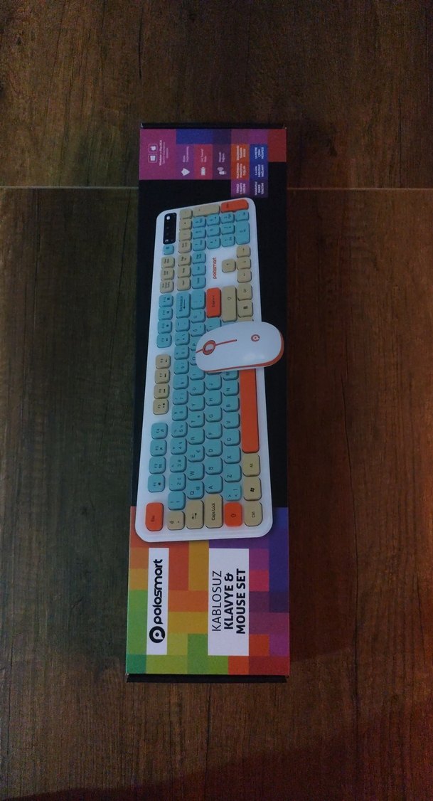 Pastel renklerde, çok renkli tuşlara sahip kablosuz klavye ve mouse seti. Yumuşak mavi, krem ve turuncu tonları ile renkli ve kullanışlı bir set.