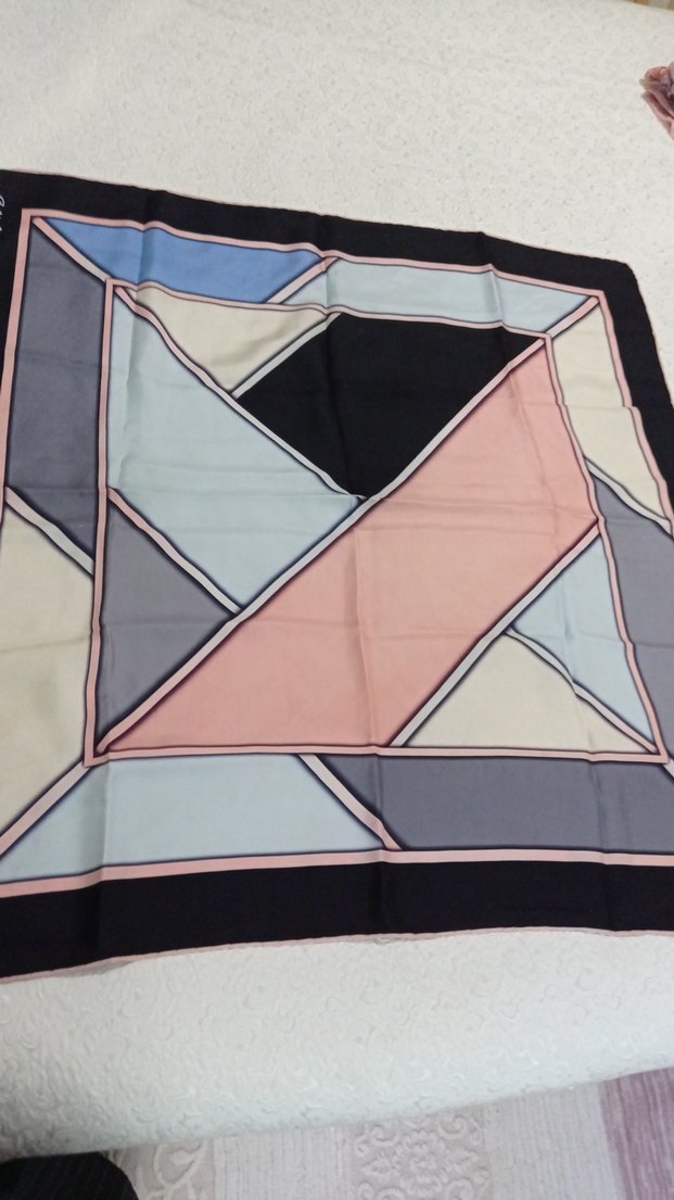 Yumuşak sentetik kumaştan, pastel çok renkli geometrik desenli, drapeli kadın fular. Moda ve avangart tarzlar için uygundur.