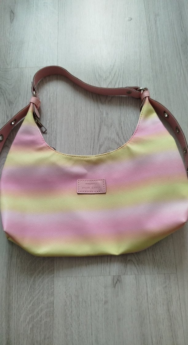 Pastel pembe tonlarında, bağlamalı askıya sahip, yumuşak sentetik kumaştan yapılmış kadın omuz çantası. Günlük sokak stiline uygun.