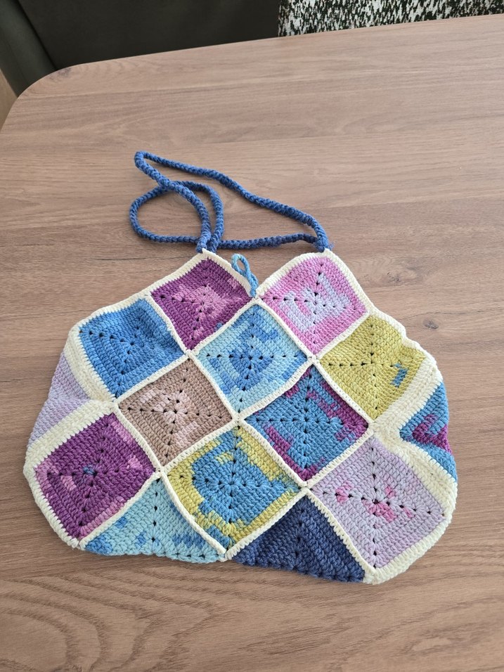 Kadın çantası, pastel çok renkli tasarımı, örgü dokusu ve uzun askısıyla yumuşak tonlarda eşsiz bir patchwork tarz sunar.