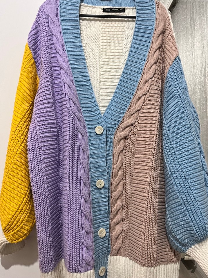 Bu kadın hırka, bol kesim, yuvarlak yaka ve uzun kolludur. Pastel çok renkli, örme kumaştan yapılmış, rahat ve bohem tarzda, günlük kullanım için uygundur. Sıcak tutar Standart beden Az kullanıldı