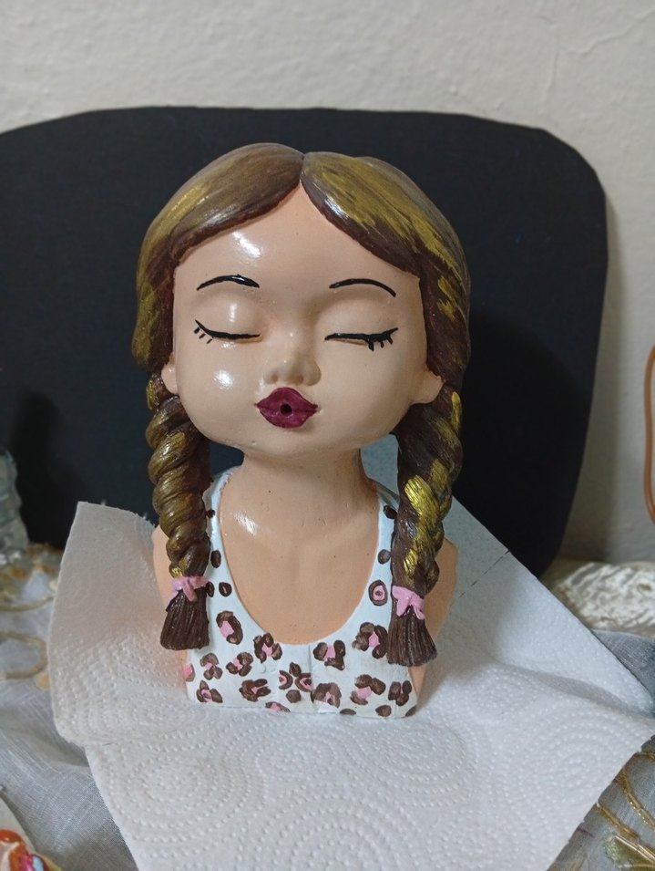 Pastel kahverengi tonlarında, örgülü saçlı ve gözleri kapalı kız figürü. Desenli üst giysisi ve sakin ifadesi bulunur.