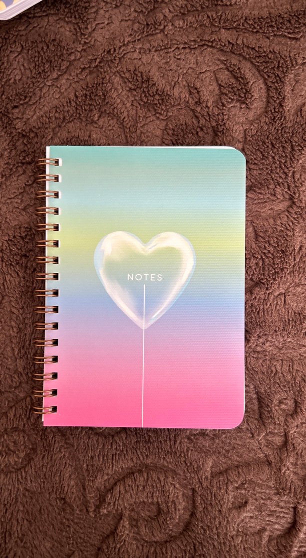 Pastel renklerde, kalp şekilli balon desenli ve "NOTES" yazılı kapaklı, spiral ciltli yuvarlak köşeli defter. İçi ÇİZGİSİZDİR.