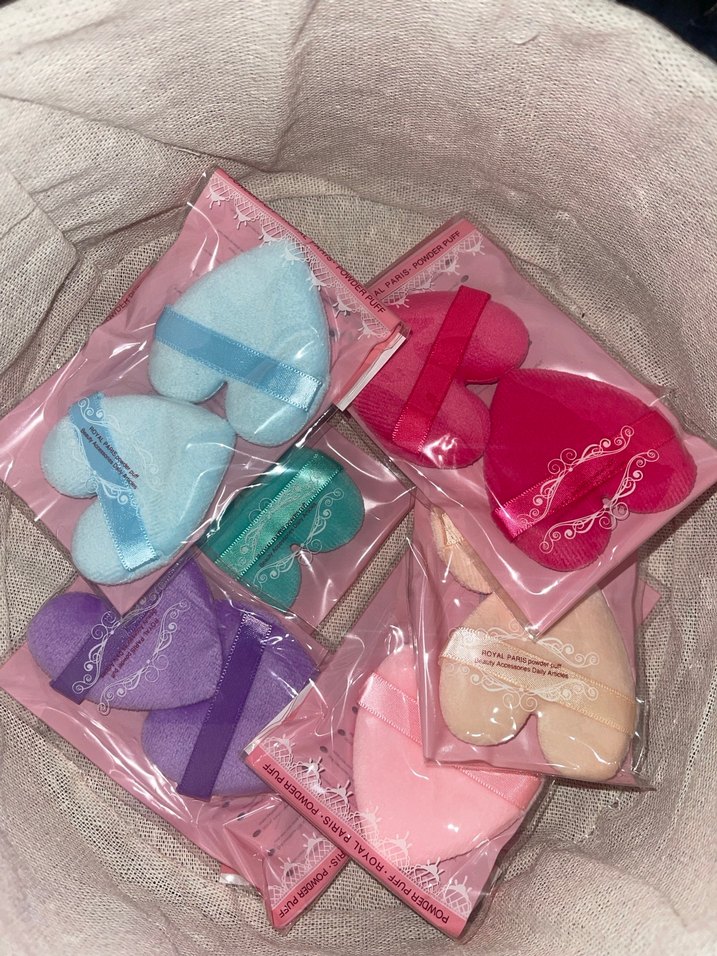Çok renkli pastel tonlarda, kalp şeklinde ve kullanımı kolay bantlı makyaj süngerleri seti.