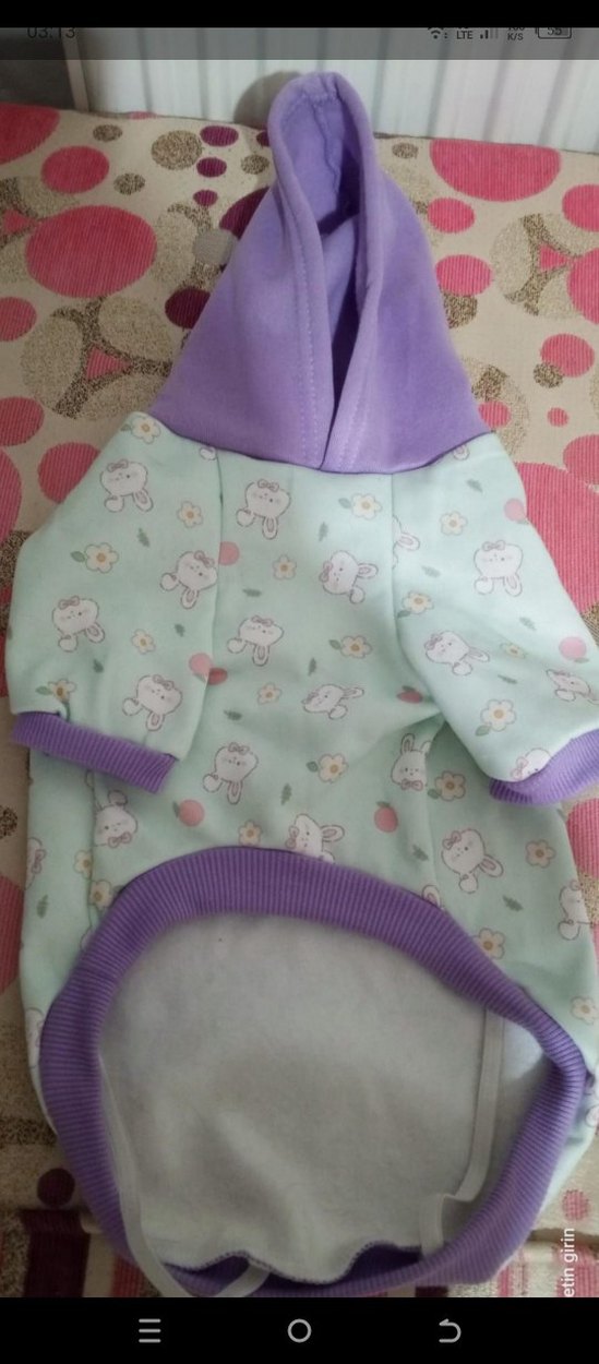 kumaştan yapılmış, pastel renkli ayıcık ve çiçek desenli kapüşonlu köpek kıyafeti. Mor ribana detayları bulunur. SIFIR ÜRÜN. ÖLÇÜSÜ FOTOĞRAFTA EKLİ