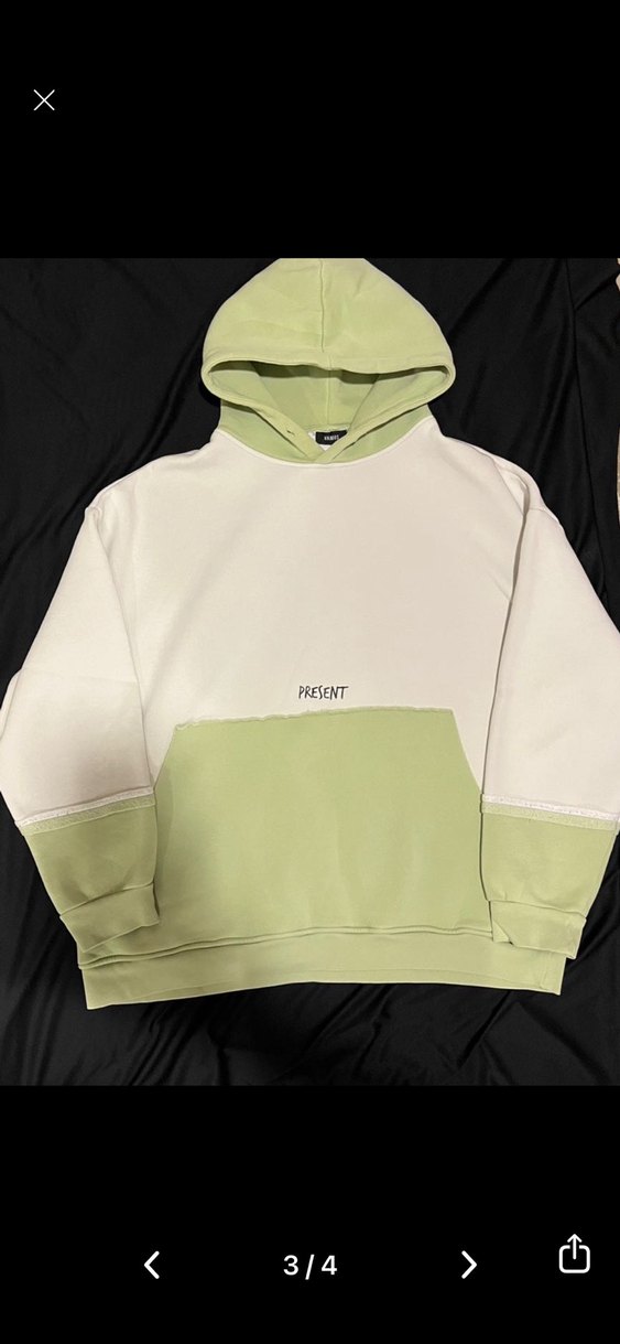 uzun kollu, kapüşonlu, beyaz ve açık yeşil pastel renklerde bol kesim sweatshirt. Önünde "PRESENT" yazısı ve kanguru cepli, rahat ve şık.