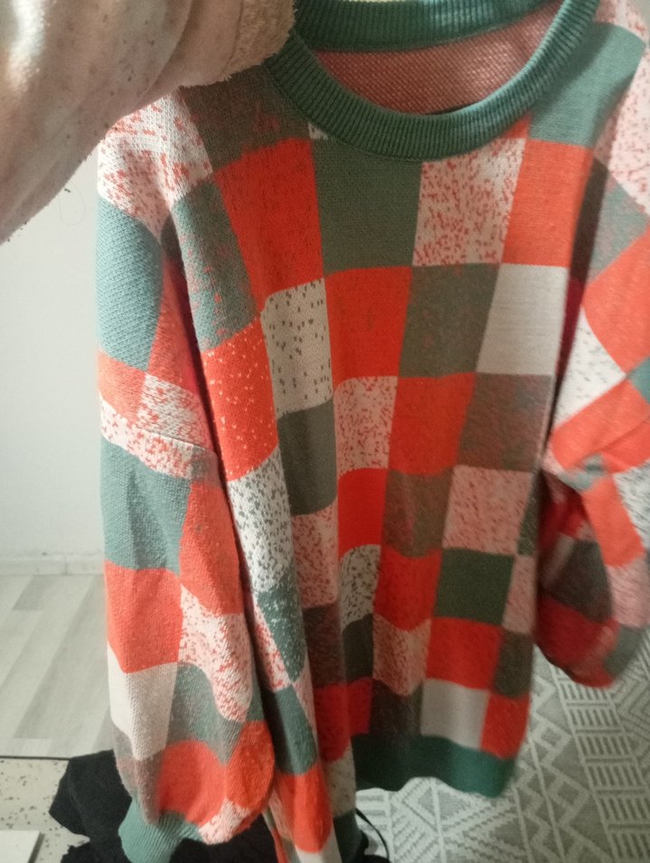 Kadınlar için örme, bol kesim, yuvarlak yaka ve uzun kollu bir kazaktır. Pastel renklerde kareli desenli, yumuşak sentetik kumaştan yapılmıştır, günlük kullanım için uygundur.