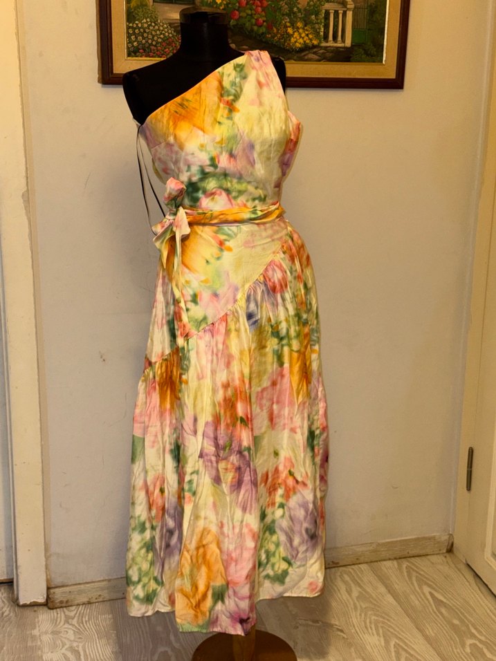 Uzun, kayık yakalı ve bol kesim olan bu elbise, pastel renkli batik desenli ve satenimsi kumaştan yapılmıştır. Bohem tarzını yansıtır, düğün için uygundur.