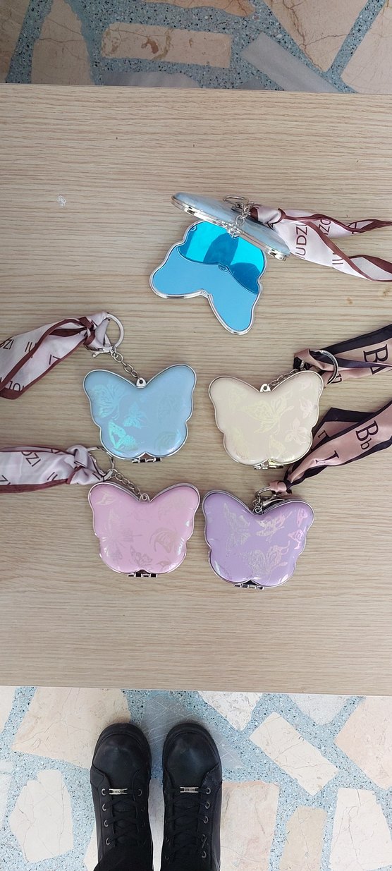 Pastel renklerde kelebek şeklinde anahtarlıklar, kurdele detayına sahip. Bohem tarzıyla retro ve Paris etkisi taşıyor. ayna