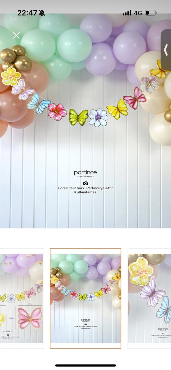 Pastel renklerde kelebek ve çiçeklerden oluşan çok renkli parti süsü, kutlamalara neşeli bir hava katıyor.