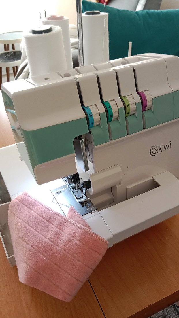 Pastel beyaz ve nane renkli Kiwi dikiş makinesi, çoklu iplik gerilim ayarlarına sahiptir. Çeşitli dikiş işleri için uygundur.