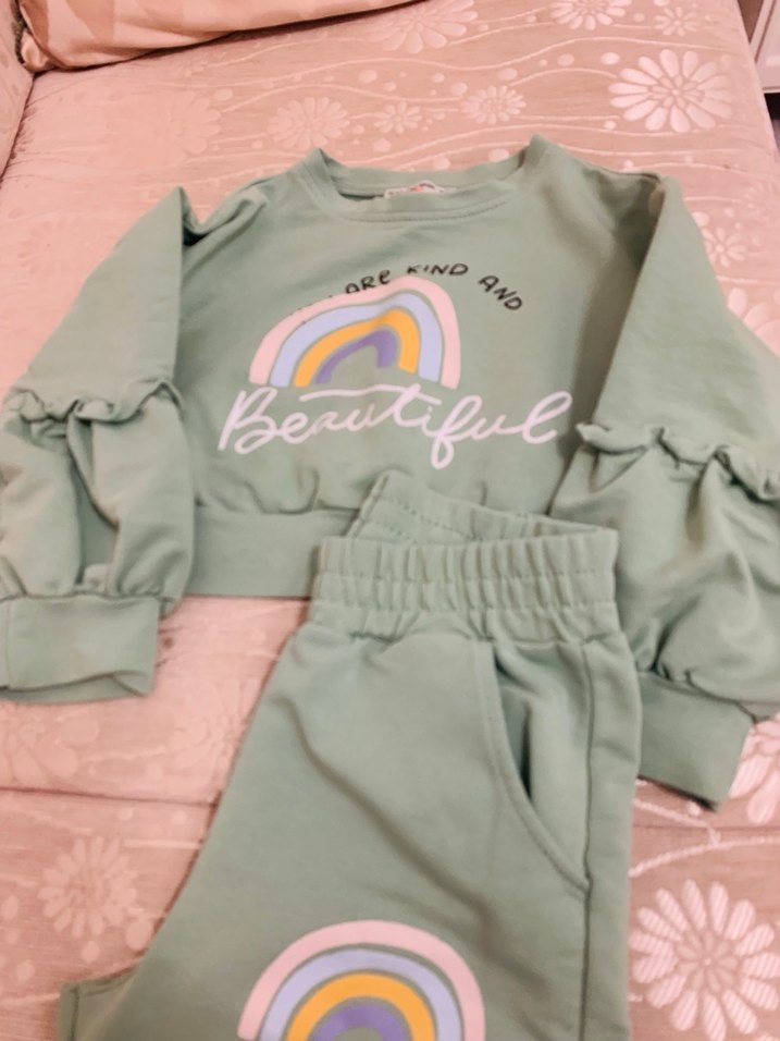Uzun kollu, fırfırlı detaylı ve çok renkli baskılı pastel yeşil iki iplik pamuk kumaştan yapılmış kız bebek takımı. Üst crop tarzı çok cici duruyor