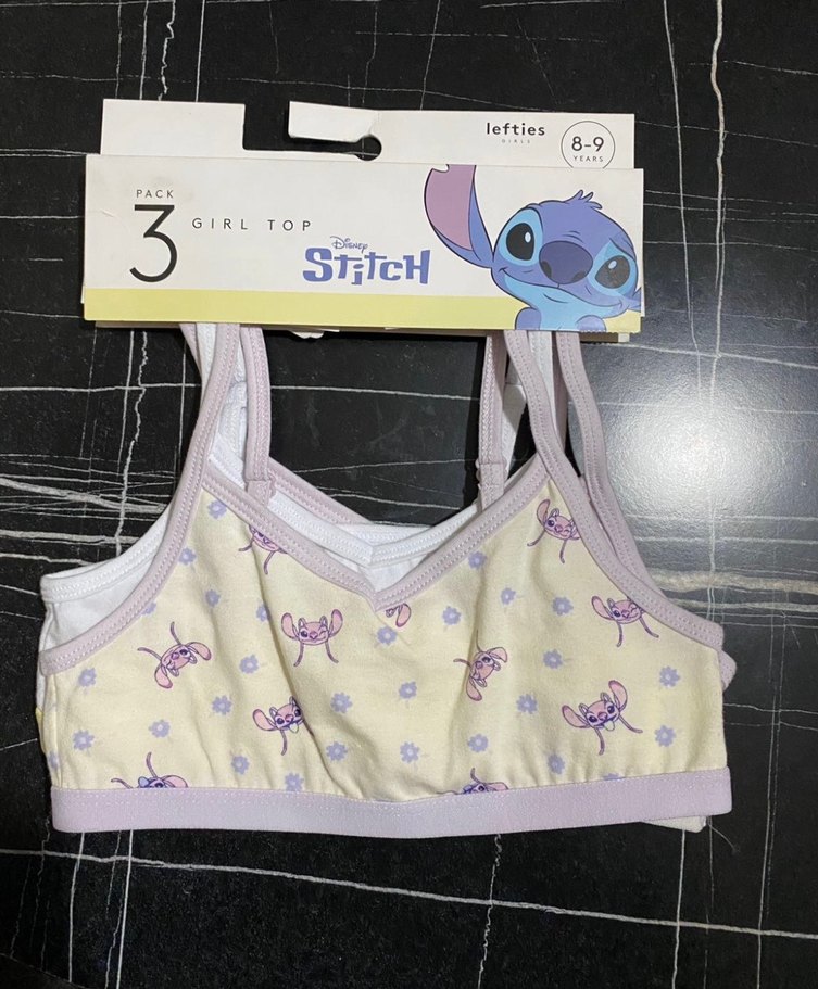 Pastel mor renkte, baskılı kısa uzunlukta kız çocuk spor sütyeni. Streetwear ve athleisure tarzına uygun, Lefties markalı ve Disney Stitch temalı.