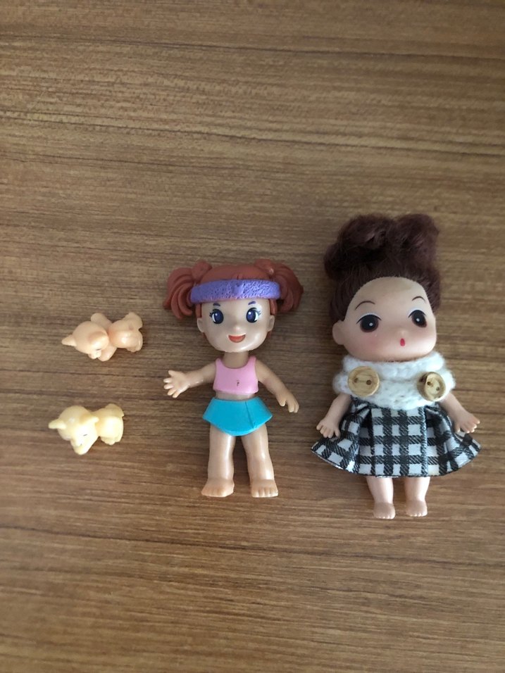 Pastel renklerde iki küçük bebek, biri mor saç bandı ve mavi etekli, diğeri kareli elbiseli. Yanında küçük oyuncak hayvanlar var. Hepsinin toplu fiyatı