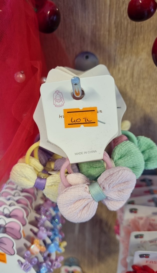 Pastel renklerde, lastikli ve bağlama desenli çocuk saç tokaları. Bohem ve retro tarzda, Çin'de üretilmiştir.