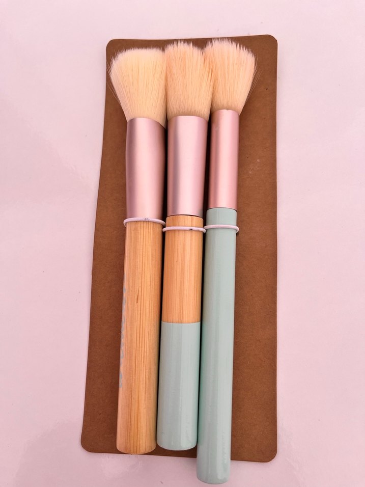 Yumuşak bej kıllara ve pastel renkli bej ile açık mavi saplara sahip üçlü makyaj fırça seti. Pürüzsüz makyaj uygulaması için ideal. ️