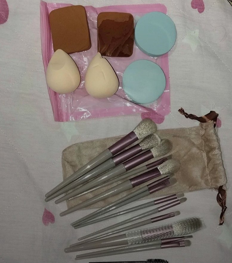 Yumuşak kıllı pastel renkli makyaj fırçaları ve farklı şekillerde bej makyaj süngerleri içeren set. Saklama çantasıyla birlikte. ️